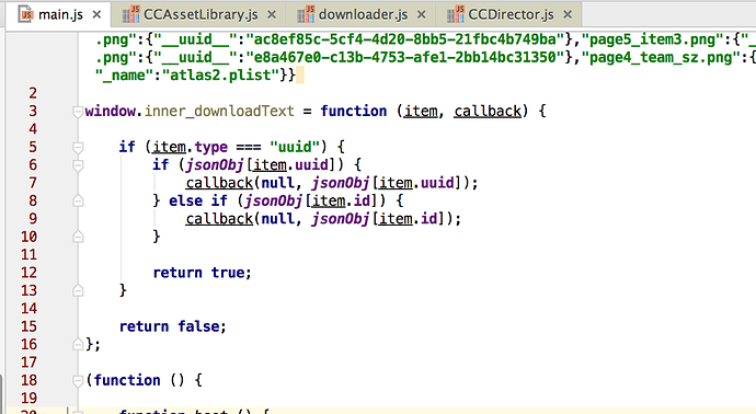 将这些json文件内容合并,然后将合并后的内容预置到main.js中,修改cocos源码,判断如果请求的是asset json则从预置的main.js中读取出来,避免网络请求;