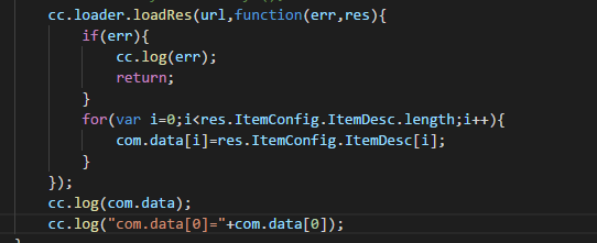 com.data是在loadRes的回调里才赋值的,而且loadResde的过程是异步的,也就是你输出log的时候com.data还没赋值