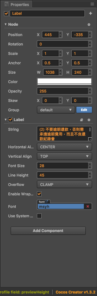 测试了一下,没找到原因。。 你在你的文字最开始输入一个换行,然后把 label 的 size 加上这个换行的高度(比如原来你的 label 是 800 * 200,假设行高是 50,你的新的 label 可以改成 850 * 200,第一行是一个空行),这样布局的位置应该也一样了。