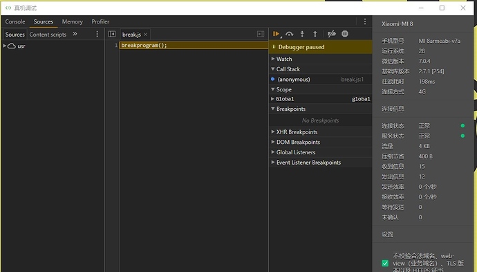 导出发布为微信小程序后,在微信开发工具里面运行正常,手机上也运行正常,但是想要调试的时候,点击真机调试,进入真机调试后会自动进入断点,不知道为什么会进入断点: