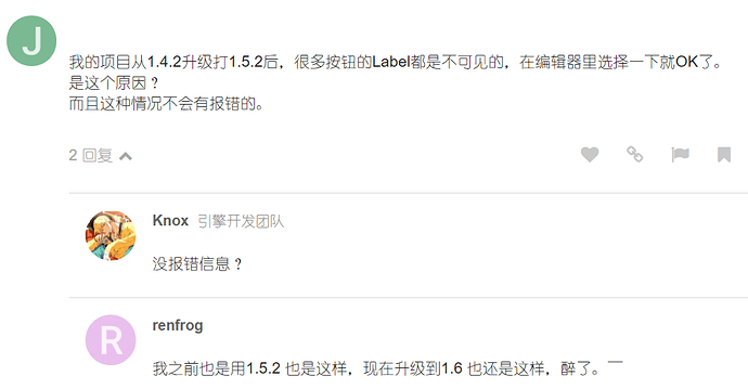 我的项目从1.4.2升级打1.5.2后,很多按钮的Label都是不可见的,在编辑器里选择一下就OK了。