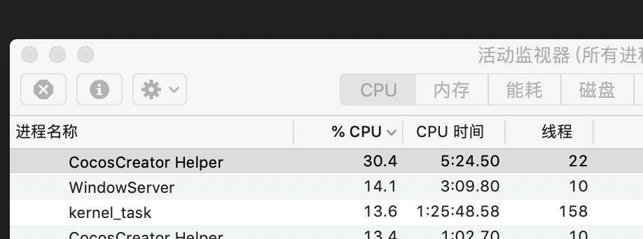 有个进程 Cocos Creator Helper占用内存16%~30%不等,稍比以前发热