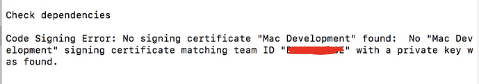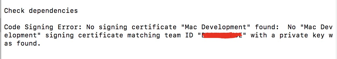 没找到签名证书“Mac Development”: 没找到与证书签名团队“xxx”的秘钥匹配的签名证书“Mac Development”。