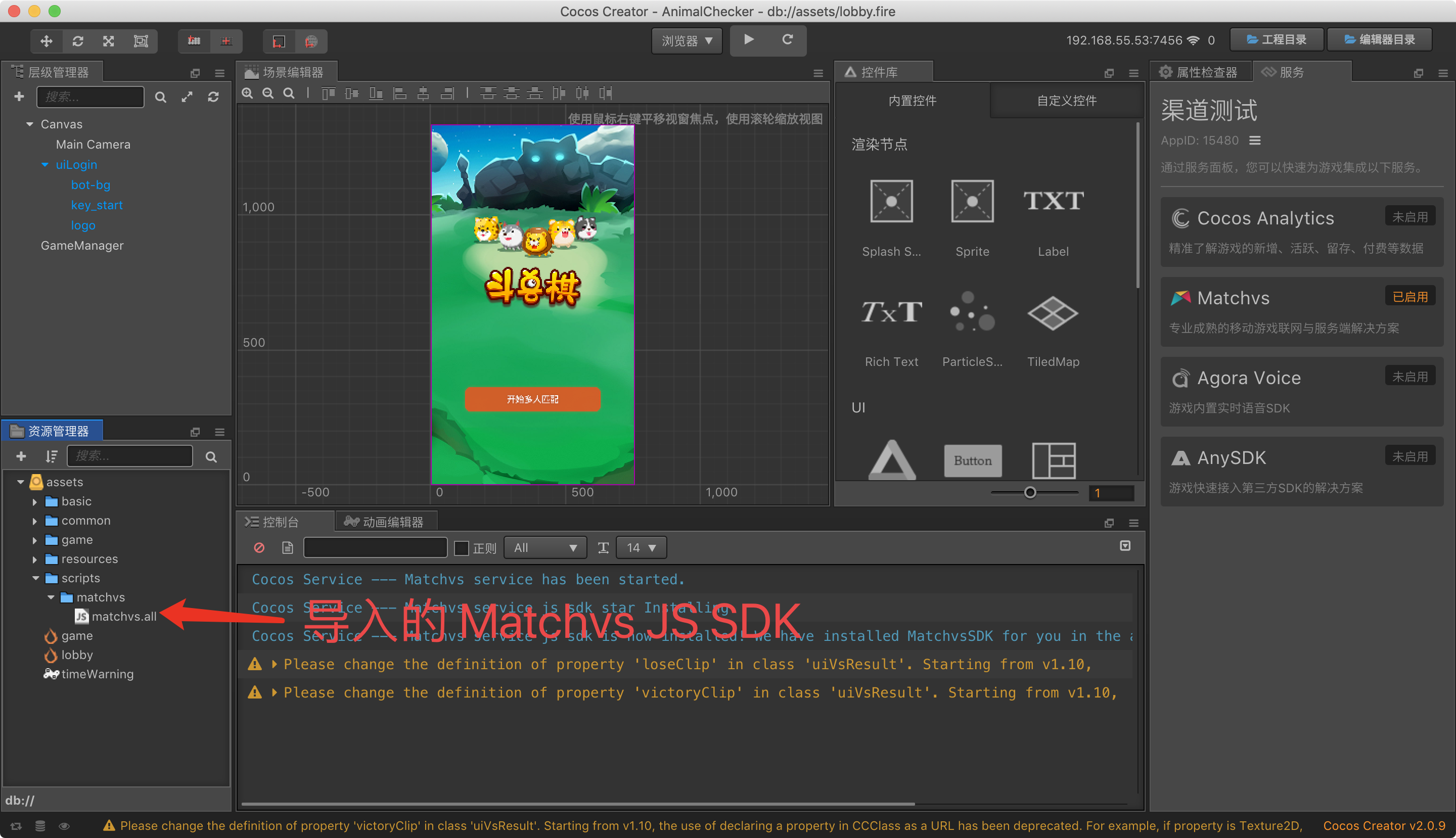 ###1、打开需要将其改为联网游戏的项目,并关联好 Cocos AppID,开通 Matchvs 服务,如图
