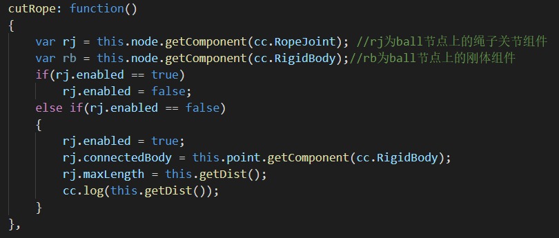 用一个getDist()函数每帧获取球与定点的距离,再根据这个距离来设置maxLength的值。我用cc.log确认了getDist()获取的结果是正确的。现在问题是我可以按键断开绳子,但是不能连接上,下面是我的代码。
