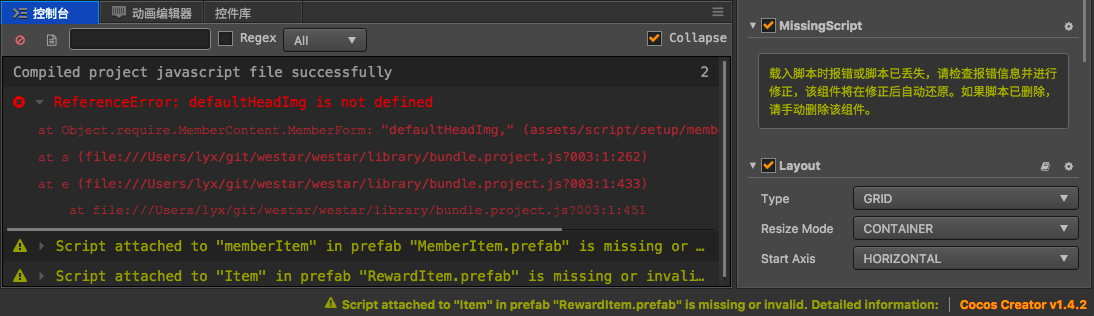 之前经常遇到好好的程序,突然全线崩溃,某个场景所有的挂载script全部MissingScript,还以为自己做错了什么。。。。刚才定义了一个变量,忘记定义类型了,就像xxxx,而不是xxxx: cc.Node,一保存,没太在意,做其他修改,一运行,整个都不好了,场景内挂载的script和相关prefab里的script全线MissingScript,控制台报错。还好及时发现是这个变量的定义引起的,修改后,所有丢失的script又回来了。