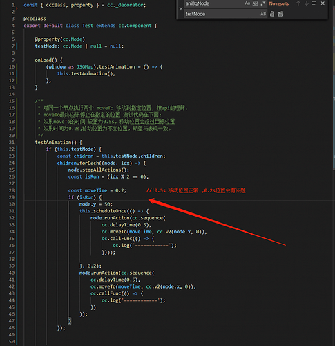 测试脚本截图如上,对一个节点做两次 moveTo ,如果按moveTo的理解,最终移动的坐标应该为设置的目标节点。