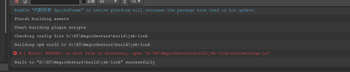 构建出错, no such file or directory, open 'D:\H5\MagicGesture\build\jsb-link\src\settings.js