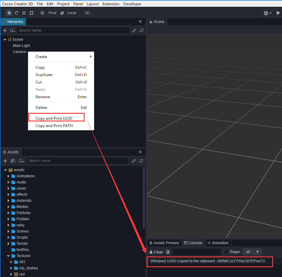 Right click on the node, and click the Copy and Print UUID item in the popup menu, it will copy the UUID for you, also it will show the UUID in the console.