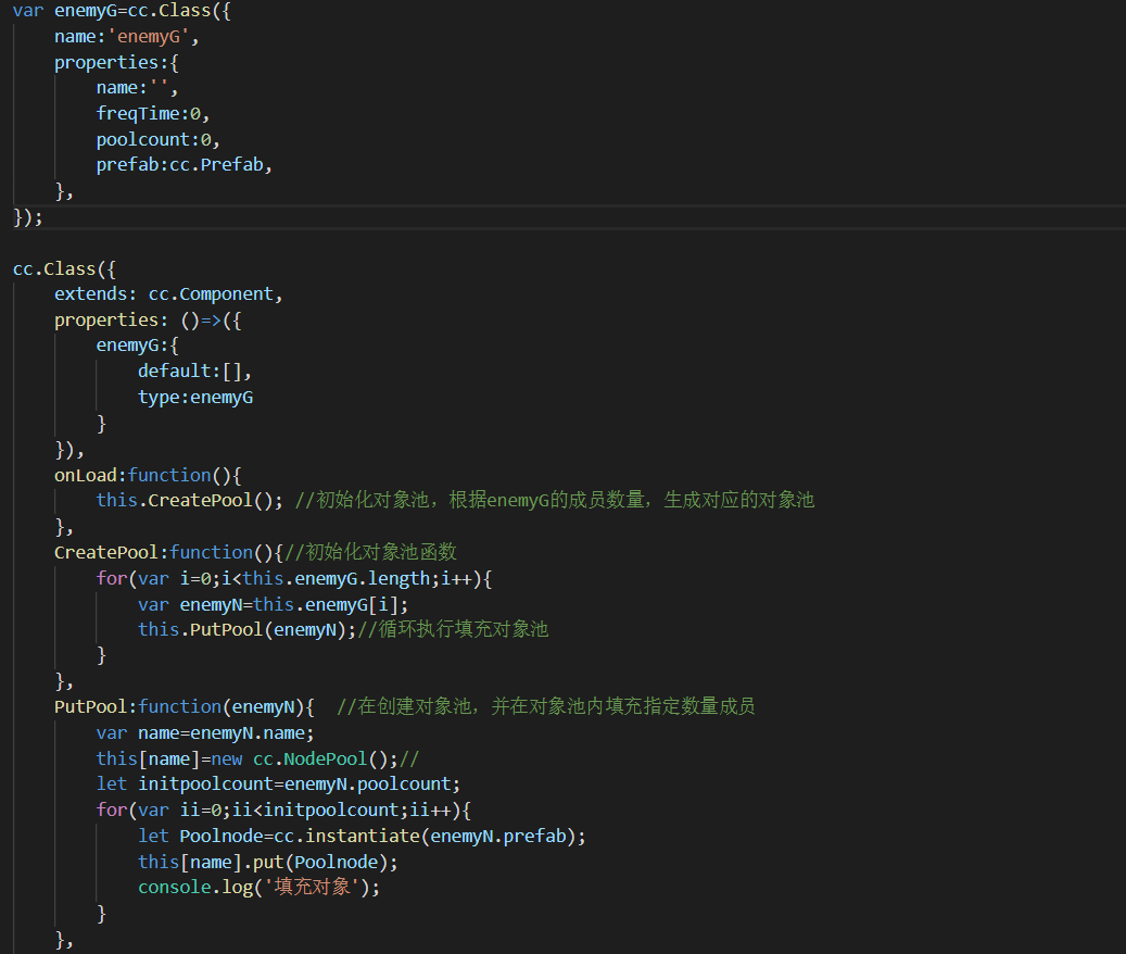PutPool:function(enemyN){ //在创建对象池,并在对象池内填充指定数量成员