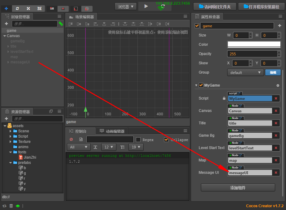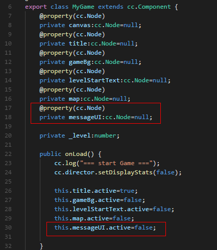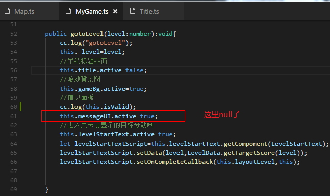 2.MyGame.ts里声明messageUI变量,onLoad()中吊销,gotoLevel函数中messageUI就null了