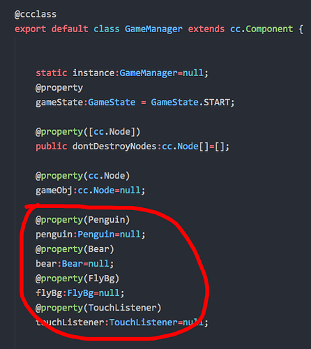 Penguin Bear FlyBg 都是自己写的类 都可以正常运行,但是在属性检查器中 前两个就显示null,无法把场景中的对象拖拽上去