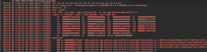 2019-07-03 11:04:45.764 8841-8841/? A/DEBUG: #07 pc 0000000001391ad8 /data/app/com.igg.android.sugarshuffle-1/lib/arm64/libcocos2djs.so