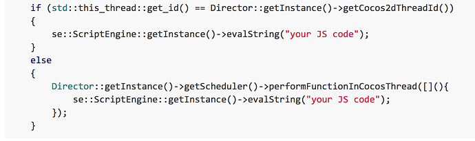 如果当前线程不是cocos2d的线程而是在其他线程的话,比如sdk的回调什么的,就把他加到计时器里,等到引擎下一次调用schduler的update时执行,相当于将这段js代码并入到了cocos2d的线程里执行