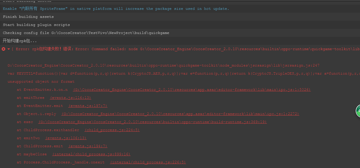 { Error: rpk包构建失败!错误:Error: Command failed: node G:\CocosCreator_Engine\CocosCreator_2.0.10\resources\builtin\oppo-runtime\quickgame-toolkit\lib\bin\index cocoscreator release --small-pack