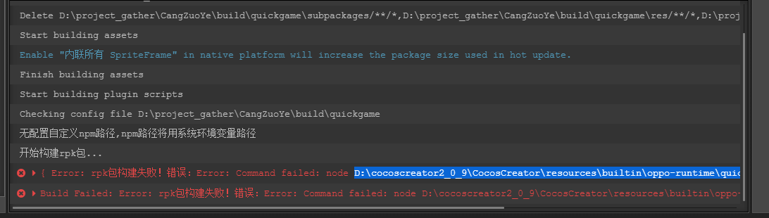 Build Failed: Error: rpk包构建失败!错误:Error: Command failed: node D:\cocoscreator2_0_9\CocosCreator\resources\builtin\oppo-runtime\quickgame-toolkit\lib\bin\index cocoscreator release