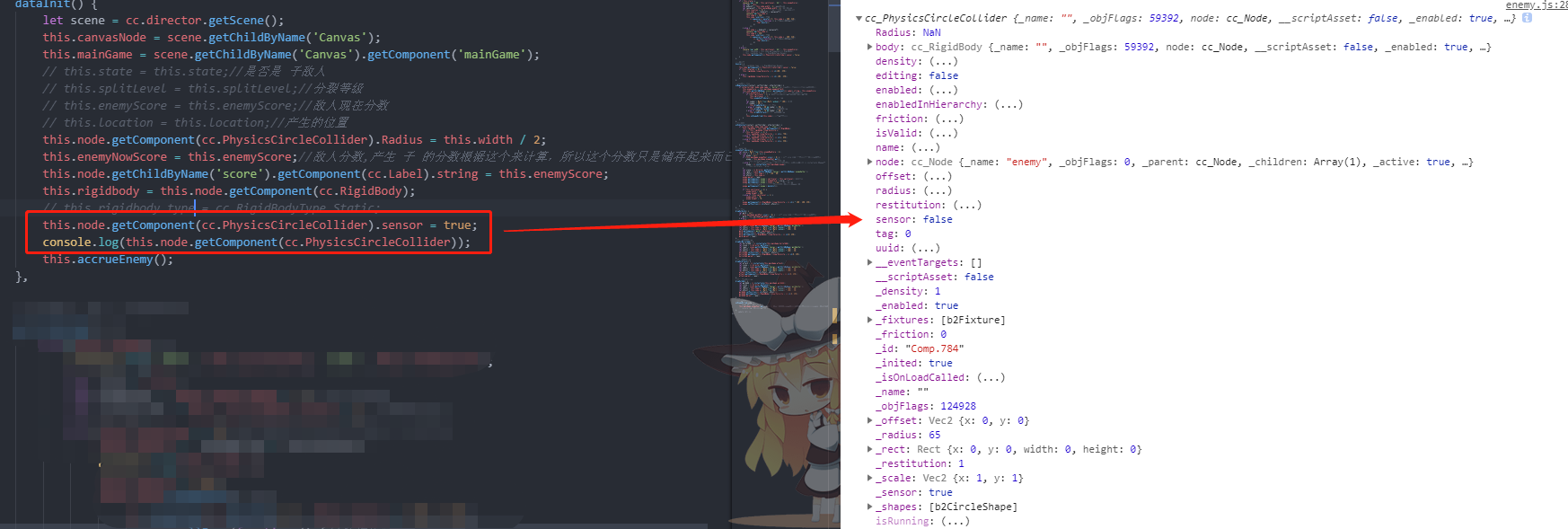 物理碰撞,PhysicsCircleCollider 》sensor 用代码开启无效。Editing 有勾选,this.node.getComponent(cc.PhysicsCircleCollider).sensor = true;无效