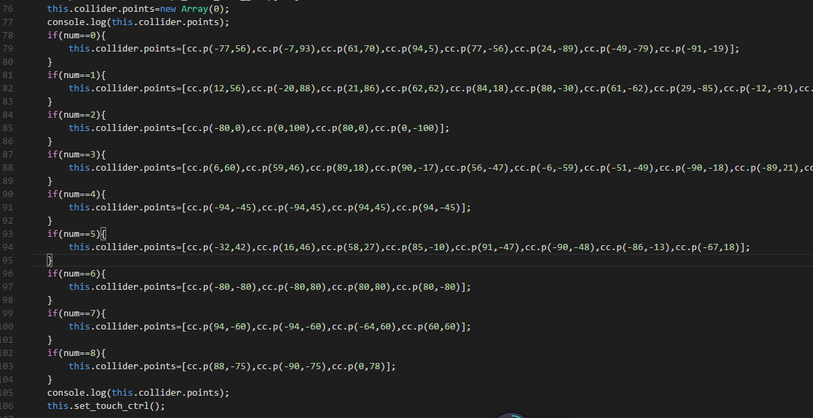 题外话:场景1中图案的不规则碰撞点的世界坐标collider.world.points不能正确显示,显示的数值和collider.points一模一样,我是自己写了个方法传入collider.points来将其转换为世界坐标,才能正确判断的。