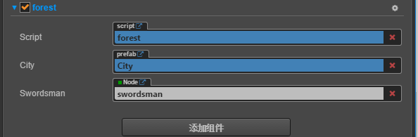 你需要把forest脚本的内容和你当前的脚本的内容贴出来才能知道问题出在哪里,脚本你引用了吗?怎么引用的?swordsman是cc.node吗?