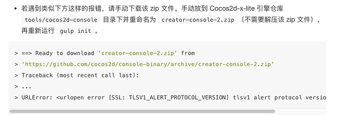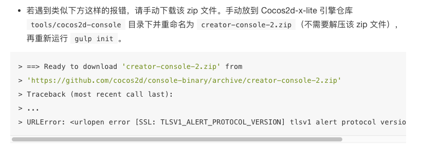 然后按照文档说去手动下载 next-10.zip 并放到tools/cocos2d-console目录下重命名为creator-console-2.zip,再次运行gulp init,还是不行