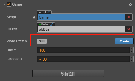 接着我希望将这个Prefeb引用设置给 Game.js 脚本里面去使用。按照教程的说法,是直接拖过去就可以了,结果发现不行,对应那边的设置属性栏里面,一直都提示:null,这个null的右边还有个绿色横线,最右边还有个蓝色按钮,上面写着Create,怎么点create都没有反应的。