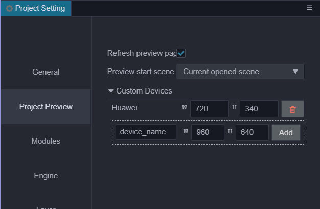 打开 项目设置 -> 项目预览 -> 自定义设备 那边可以添加