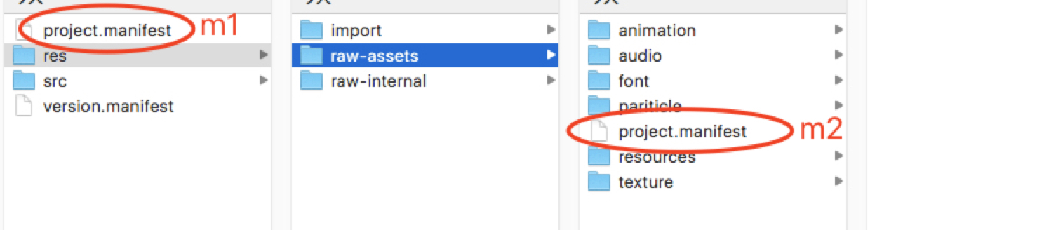 2、更新包的结构如下:热更新工具生成project.manifest为m1,包内部的project.manifest为m2.