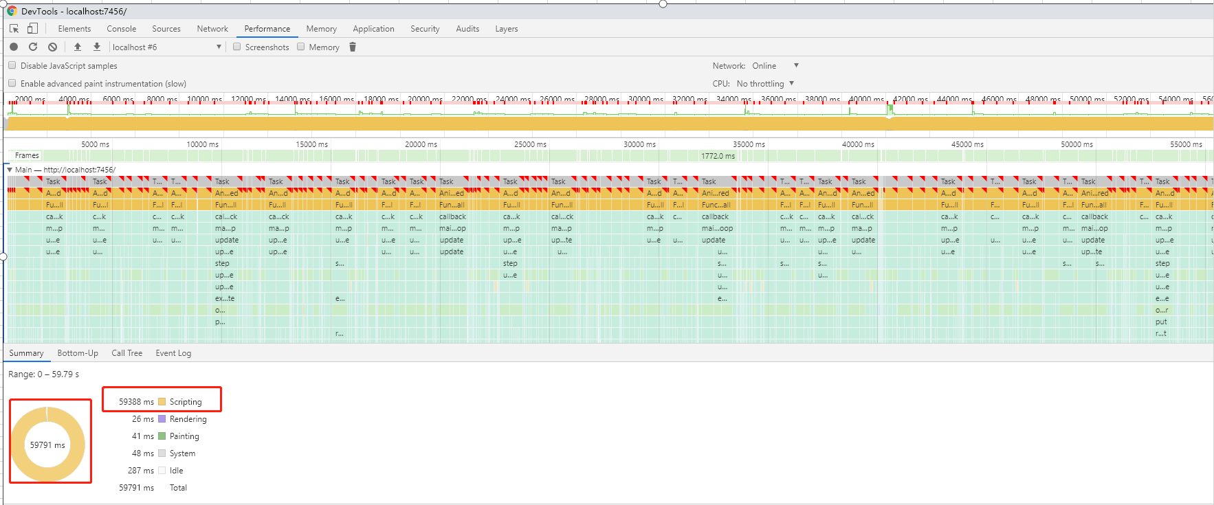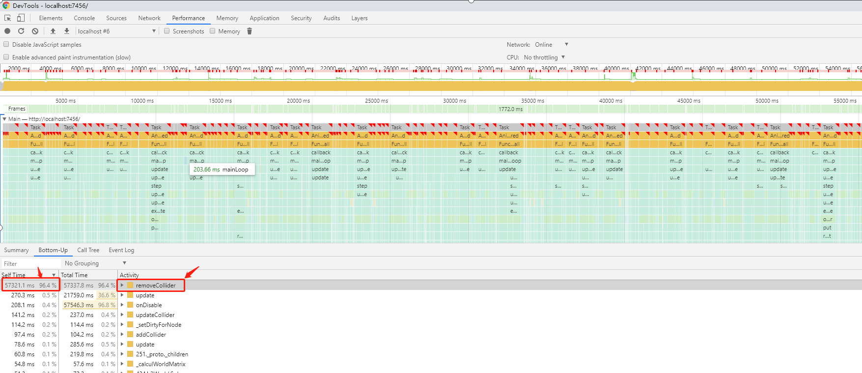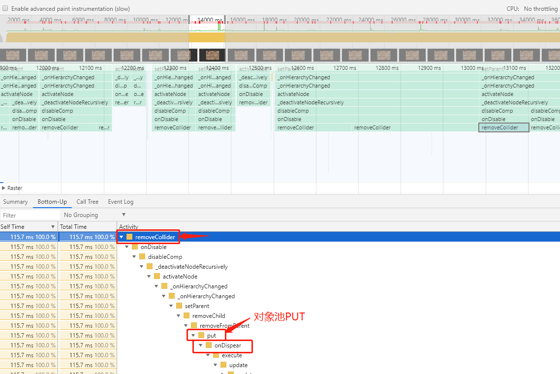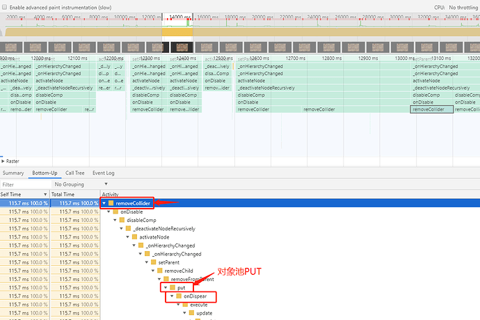 用谷歌浏览器的性能分析时,分现put到对象池后,会移除结点,调用一系列的内部函数,到最后调用removeColider也是占用最主要时间的地方。