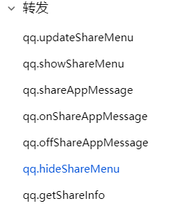 关于qq小游戏的分享,查找小游戏的官方文档只有六个接口,发布之后会自带分享 qq,空间,微信,朋友圈的按钮,通过已经有的接口已经能实现四个按钮的显示,但是点击这四个按钮依然无法实现分享功能,就像一个按钮没有绑定点击事件,而且以往对接sdk的经验来看,功能应该是作为接口腾讯提供!