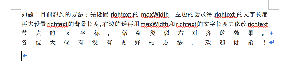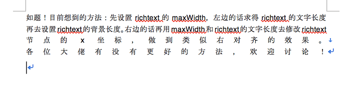如题!目前想到的方法:先设置richtext的maxWidth,左边的话求得richtext的文字长度再去设置richtext的背景长度。右边的话再用maxWidth和richtext的文字长度去修改richtext节点的x坐标,做到类似右对齐的效果。