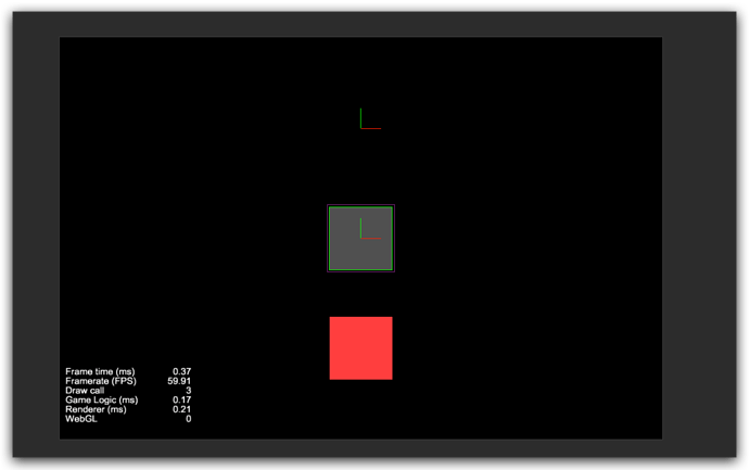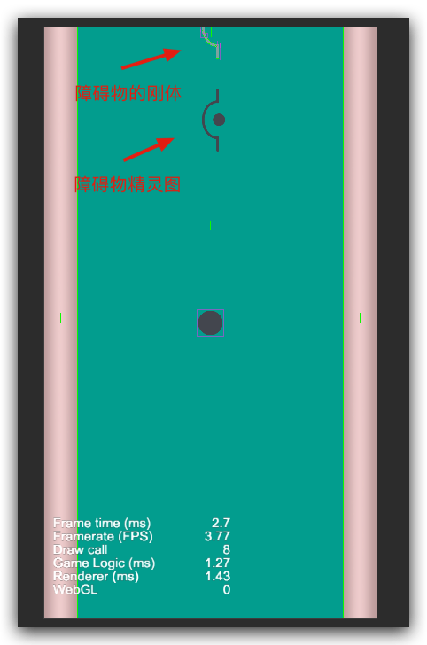由于路面的图片会挡住障碍物的刚体,所以隐藏掉路面图,只留下障碍物摄像机运行时候的渲染结果,入下图所示,在最初的时候,障碍物的定位是在整个屏幕的最上方,分辨率为1080*1920,所以障碍物的坐标为【0,960】,在随着障碍物摄像机的往前推进,障碍物的位置不断的往下走,可是刚体却一直在顶部。