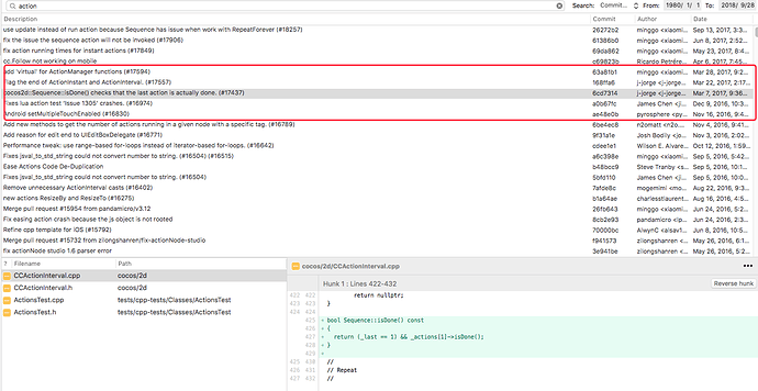 上面2条导致了没有重写isDone的子类如果是Sequence的最后一个子动作,就会出现一直调用update(1)而不会停止的情况。发现这个问题是源于我在一个Sequence动作的最后一个动作用了ActionFloat,而它一直在被调用。我看了下github的改动历史,这个问题应该是一直存在的。还望引擎组尽快修复下。@minggo