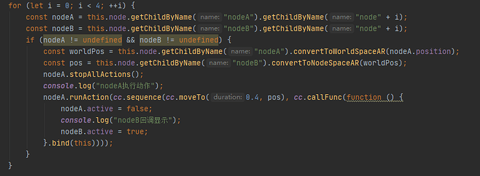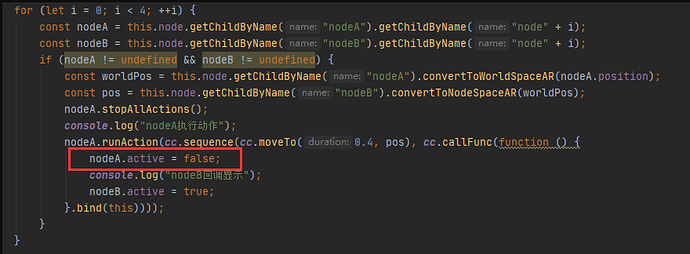但是 4个nodeA的moveTo动作都执行了 就最后nodeB显示的回调 只会有一个nodeB被显示出来 打印信息也只有一条