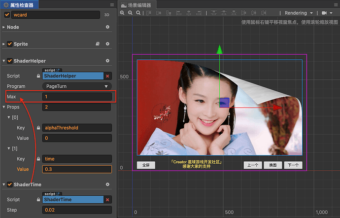 首先是原来在 ShaderTimer 组件上的 max 属性被移到 ShaderHelper 组件上了