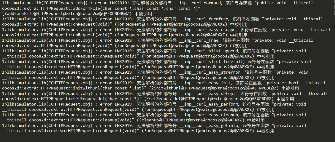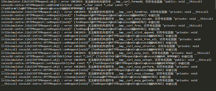 libsimulator.lib(CCHTTPRequest.obj) : error LNK2019: 无法解析的外部符号 __imp__curl_formadd,该符号在函数 “public: void __thiscall cocos2d::extra::HTTPRequest::addFormFile(char const *,char const *,char const *)” (?addFormFile@HTTPRequest@extra@cocos2dQAEXPBD00Z) 中被引用