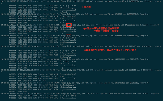 app后台一段时间后,服务器主动断开第一条连接,当app再次切到前台第二条连接又有正常心跳了,但是之后客户端发送的协议服务器已经不处理了