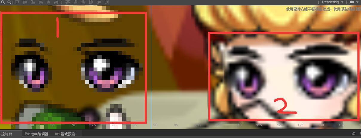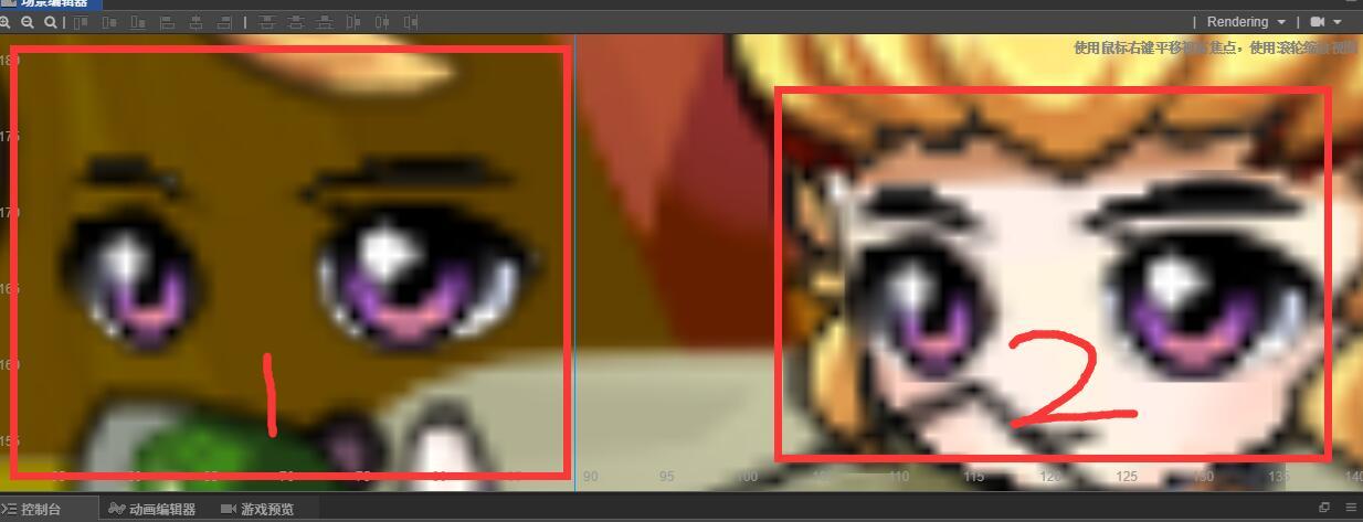 邻近过滤模式下,左为 sprite组件 (像素颗粒化), 右为 Spine组件 (无变化)