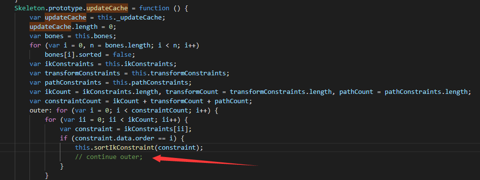 还好自己改得动引擎,折腾一天。断点发现只会去运行一个ik,我们游戏的spine有1个以上的ik,实际只会运行第一个ik,后面的ik不会被运行。