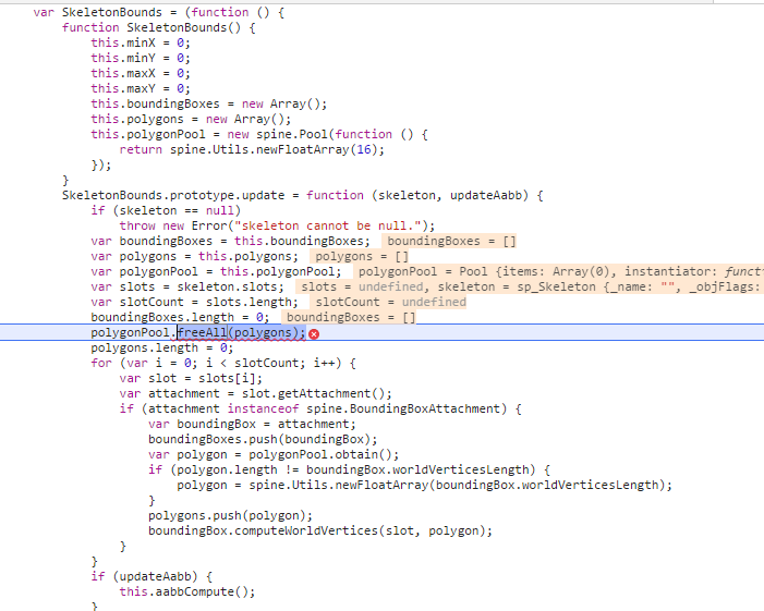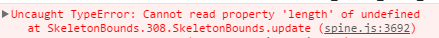鼠标点击后调用update方法,spine.js内报错了