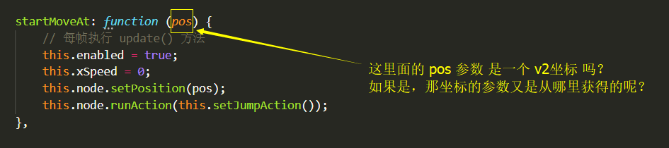 问题是:setPosition 括号里面应该有两个参数,比如 setPosition(100, 50) 或者 setPosition(cc.v2(100, 50)),而这里是 setPosition(pos),那 x、y 轴的坐标 又是从哪里赋的值呢?