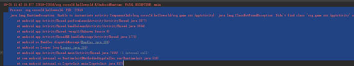 java.lang.RuntimeException: Unable to instantiate activity ComponentInfo{org.cocos2d.helloworld/org.game.zzx.AppActivity}: java.lang.ClassNotFoundException: Didn’t find class “org.game.zzx.AppActivity” on path: DexPathList[[zip file “/data/app/org.cocos2d.helloworld-sAyITowZBvZOcXdt9Ovc8g==/base.apk”],nativeLibraryDirectories=[/data/app/org.cocos2d.helloworld-sAyITowZBvZOcXdt9Ovc8g==/lib/arm, /system/fake-libs, /data/app/org.cocos2d.helloworld-sAyITowZBvZOcXdt9Ovc8g==/base.apk!/lib/armeabi-v7a, /system/lib, /vendor/lib]]