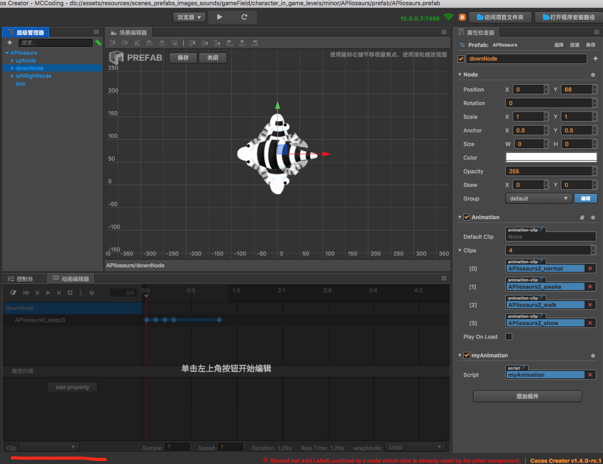 5、在这个 prefab 的根节点上创建一个新的 clip,编辑,然后保存