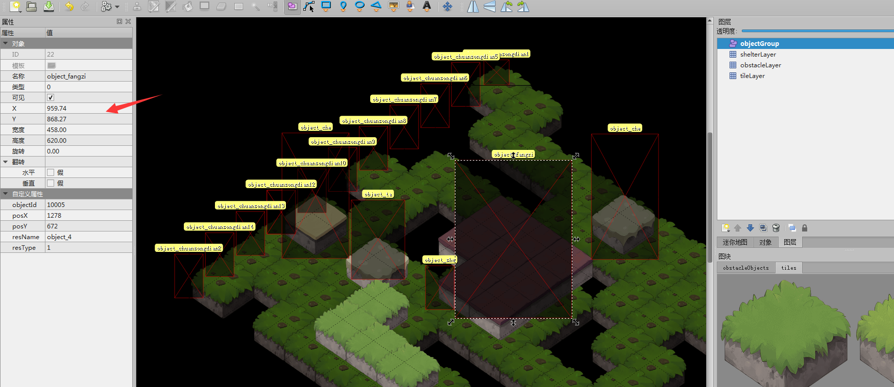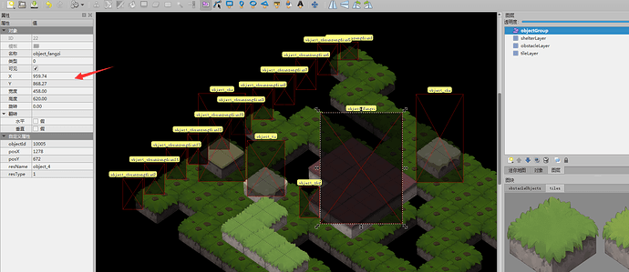 如图 objectGroup中的一个对象 object _fangzi的箭头处坐标是基于瓦片地图的,因为这个对象不是跟地图格子一一对应 是可以随意挪动的,现在怎么求把这个坐标转换成游戏中的世界坐标,游戏需要根据这左边创建node对象