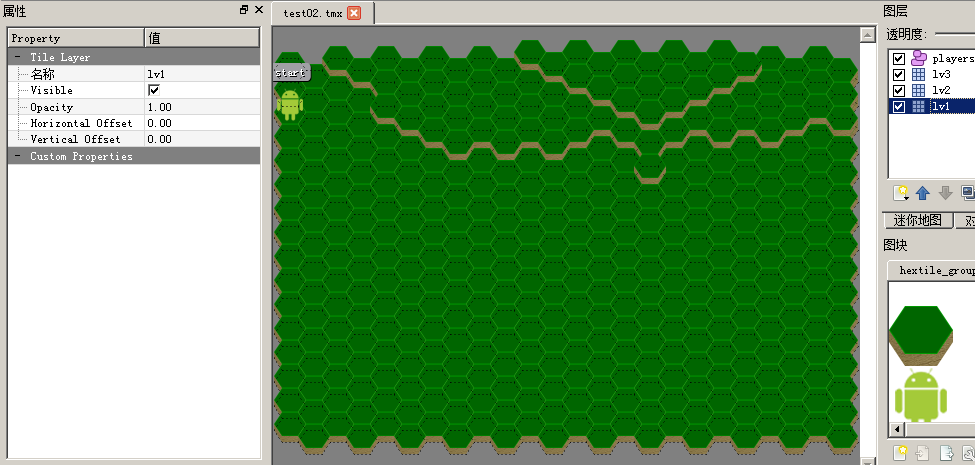 我在Tiled Map Editor里面制作了一张六边形地图,具体设置大致如下: