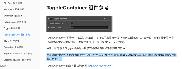 我说的是 在指认toggle组件的主组件时 只有toggle group选项,无法将主组件挂载的toggleContainer组件 指认上去, 只能指认挂载有toggle group的。 不知我这样表达是否清晰!
