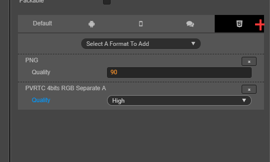比如在下图所示的位置增加一个增减的功能,可以增加一个特定环境的压缩纹理设定,比如同样是H5的,我想有些设定是高清模式,有些是快速模式?同样,其他的android环境也是如此,想设置 一个高清版的和一个小包版的,现在一刀切,很难受