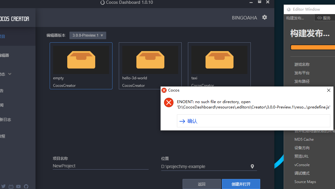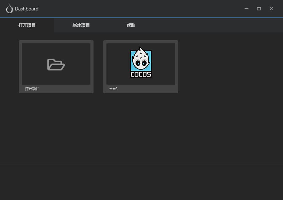 1.3 使用 dashboard 打开原有项目 2.4.3,并不会直接打开,而是打开了 cocos-3.0.0 自己的启动选择项目的窗口,尴尬。。。。 - 不使用 dashboard,直接打开 cocos-3.0.0-preview.1 可以打开,并创建 helloworld