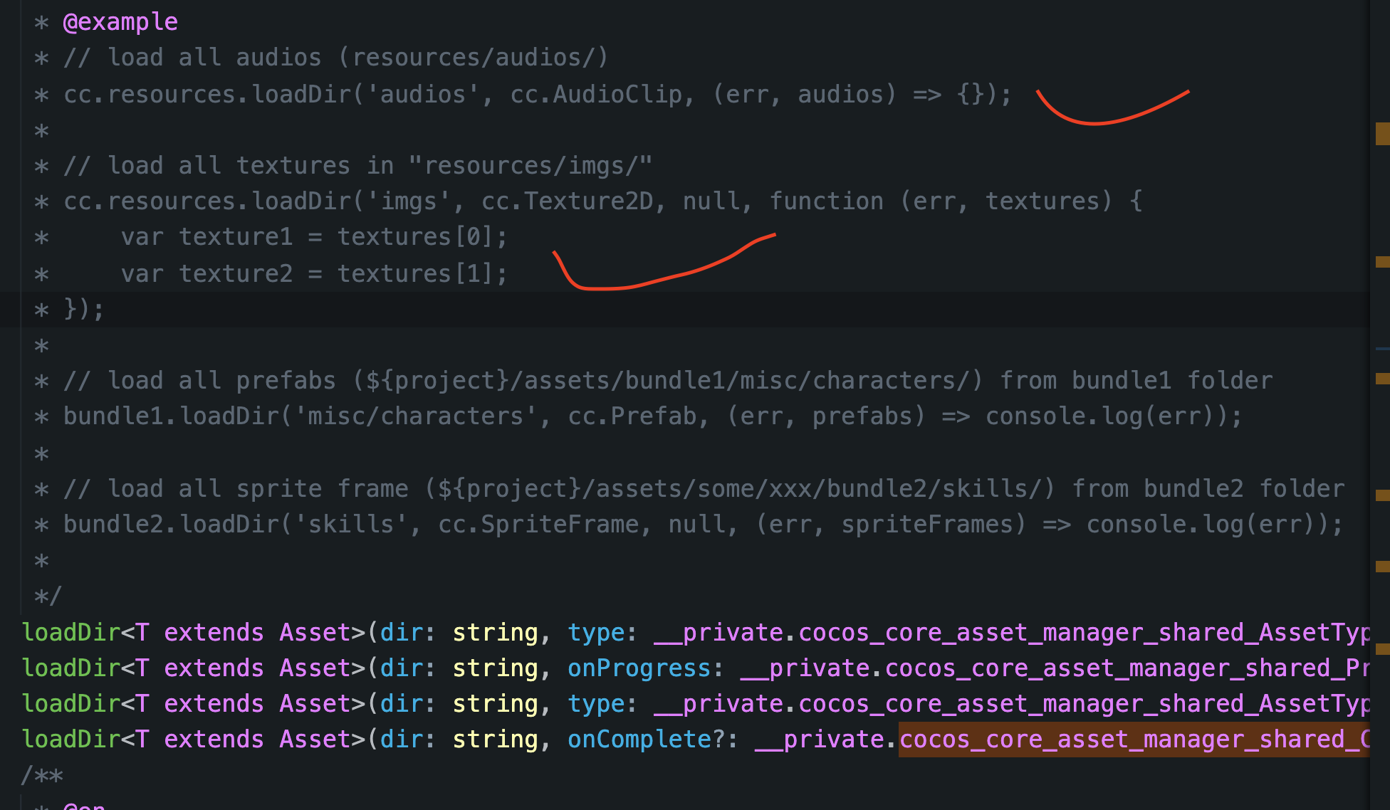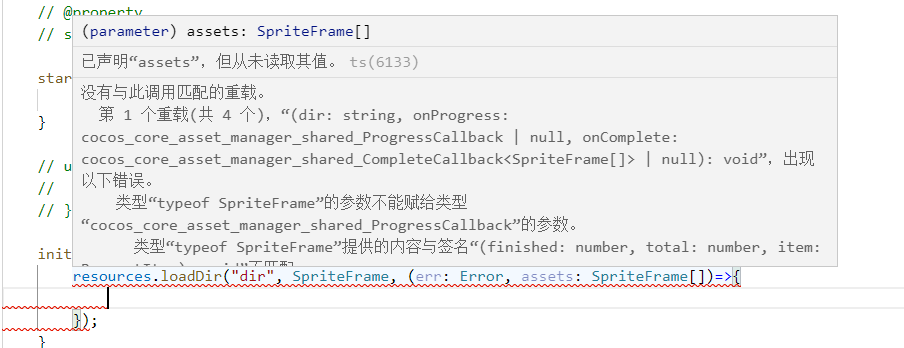 你应该是想用第一个的重载的方法吧那么第三个参数应该是一个进度函数或者为null,第四个才是完成回调函数,重载第三个应该是这样的resources.loadDir(‘dir’,SpriteFrame,(err: Error | null, data?: SpriteFrame[] | null)=>{})