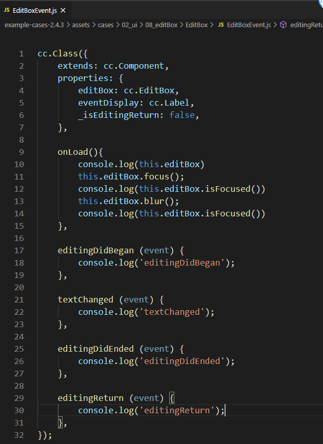 重现方式:官方用例:example-cases-2.4.3 ui组件 EditBoxEvent 场景 用例代码截图: