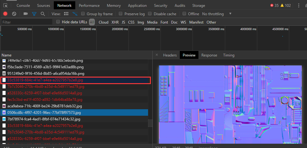 在network窗口 可以看到33号文件加载失败 而其余加载成功的文件在预览窗口可以看到预览